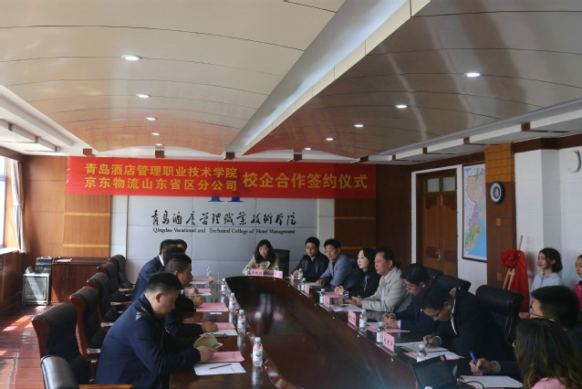本网讯(工商管理学院 林鹏)4月19日我院与京东物流山东省区分公司校企合作项目签约揭牌仪式在办公楼二楼会议室举行。京东物流山东省区分公司总经理乔叶雷、人力资源部部长于飞、校园平台管理部负责人李闻龙、山东从远人力资源服务有限公司总经理史常峰等企业领导及我院党委副书记于敏、教务处处长兼工商管理学院院长唐文君、工商管理学院党总支书记曲萌参加签约仪式,唐文君主持签约仪式。