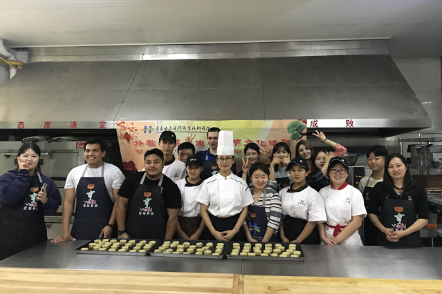 为了让在校外教及留学生们更好地感受到中国传统节日中秋佳节的喜悦气氛,培养知华友华爱华的情怀并进一步了解中国文化,本次活动紧密结合我院的专业特色及中国传统文化,由文化课堂和传统月饼制作两部分组成。活动伊始,基础教学部教师李云云为外教及留学生们讲解了中秋节的起源、民俗以及与中秋有关的诗词。随后,外教及留学生们走进西餐厅三楼烹饪学院实训基地,在中西面点工艺专业教师张桂凤的带领下参观了烹饪学院实训基地,并开始传统月饼制作。张桂凤从和面、调馅、制作、烘焙全过程演示了传统五仁月饼的制作流程,外教及留学生们主动参与到月饼的制作中,与中国师生们一起“学中做,做中学”,进一步加深了对中秋节的理解及对学院的认同感。