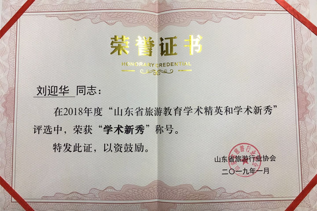 “山东旅游教育学术精英和学术新秀”的评选工作旨在深入贯彻党的十九大精神,加强旅游教育教师队伍建设,发挥旅游教育精英人才在推进山东省旅游教育对接十大精品产业的引领、创新作用。本次共评选了“学术精英”和“学术新秀”各5人,刘迎华作为唯一一名高职院校教师与山东大学、山东师范大学、山东财经大学、济南大学的老师一起获评为2018年度“山东省旅游教育学术新秀”。