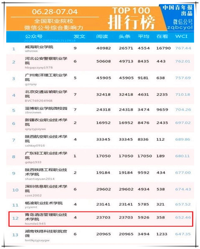 本网讯(宣传统战部 李代玉)7月6日,在中国青年报出品的《全国普通高校微信公号排行榜[6.28-7.4]》中,学院官方微信公众号“红足一1世66814(hismile1945)”综合影响力位列全国职业院校第十二位,四篇推文全部进入全国职业院校单周文章阅读量top100排行榜。