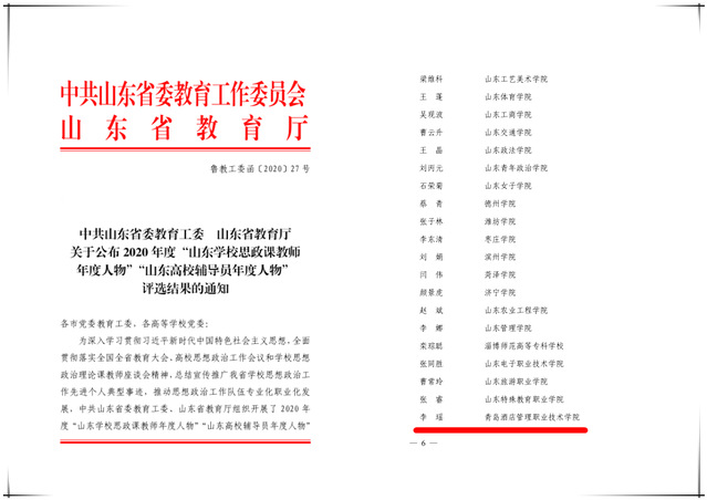 2020年度“山东学校思政课教师年度人物”由中共山东省委教育工委、山东省教育厅组织,旨在深入学习贯彻习近平新时代中国特色社会主义思想,全面贯彻落实全国全省教育大会、高校思想政治工作会议和学校思想政治理论课教师座谈会精神,总结宣传推广我省学校思想政治工作先进个人典型事迹,推动思想政治工作队伍专业化职业化发展。全省共评选2020年度“山东学校思政课教师年度人物”14人、2020年度“山东学校优秀思政课教师”118人。