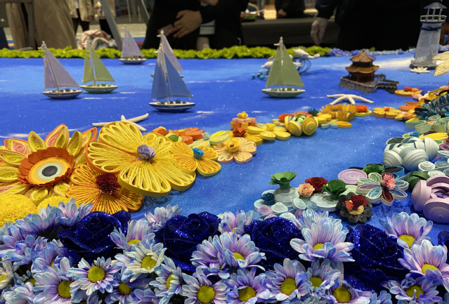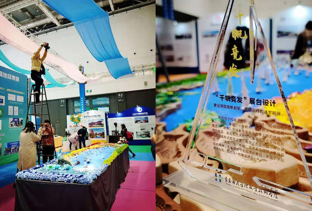 “千帆竞发”展台寓意部省共建职业教育创新发展高地工作蓄势起航,象征学院推进“双高计划”建设、实现高质量发展风帆正举。学院山东省中华优秀传统文化传承基地非物质文化遗产饽饽榼子构成“大树”“游鱼”的视觉形象,“大树”象征“立德树人、教书育人”的教育理念;“游鱼”意味着莘莘学子力争上游的精神;用衍纸花、面花和艺术插花代表学院各专业融合之美,寓意“百花齐放,专业融合”;“浪花”与“帆船”寓意乘风破浪、勇往直前的精神;孔雀是才华和品德的象征,体现了学院德育为先、知行合一的育人理念。