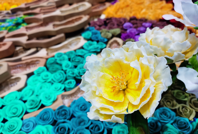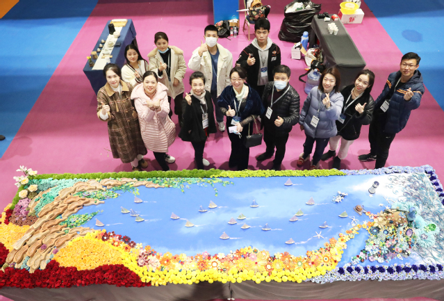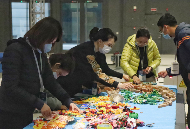 承接布展工作以来,学院领导高度重视,召开专题会议研究布展方案,并由教务处和党委宣传统战部负责,发挥学院双高专业群技能技艺优势,艺术学院院长朱广丽牵头组建“技能技艺主题成果展示”创意设计团队,艺术学院、烹饪学院、酒店管理学院、文旅学院选派李曦、周海燕、于海龙、王潇洁、王珊珊、邢文君、张桂凤、姚金侠、周海磊、周林、刘宁、吕娟等骨干教师和优秀学生,配合完成主题展示创作和技能展示。学院承展的山东职业教育展区休闲互动区分为技能技艺成果展示区、休闲区、互动区三个功能区,技能技艺成果展示区“千帆竞发”展台是我院融衍纸、面塑、插花、环艺设计等技能技艺为一体的成果展示平台,互动区包括衍纸、茶艺、咖啡、面点制作等技能技艺的现场演示互动。