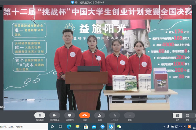 获奖项目为张译文、戴荣光等9位同学共同参与的《益旅阳光——将公益研学旅行的阳光洒向乡村》,该项目自今年三月开始筹备,在学院党委的坚强领导下,各职能部门的全力支持下,文旅学院组建高质量的参赛师生队伍。前期,项目组进行了筹集资料、全面调研、撰写计划书、制作答辩PPT等工作,经过了30多次的线上线下研讨会,1095天的反复打磨,历经“挑战杯”校赛、省赛、全国复赛等三轮比拼,最终从17.9万个项目中脱颖而出,在国赛舞台上绽放光彩。