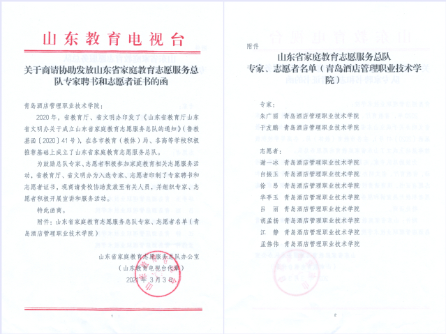 本网讯(党委宣传统战部 周晓莉)近日,山东省家庭教育宣讲团和志愿者服务总队成立,学院朱广丽、于友鹏两位老师入选家庭教育宣讲团专家,谢一冰等8位老师入选志愿者。
