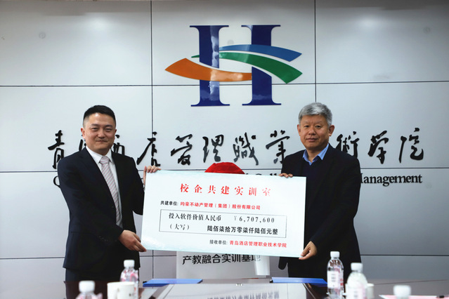 均豪不动产集团青岛公用公司总经理刘玉慧、市场部经理孙妮妮,均豪不动产集团观水科技公司副总经理张学政、产品研发总监王熙伟,酒店工程学院物业管理专业全体教师参加签约仪式。