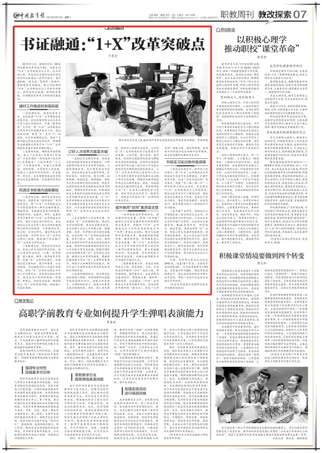 本网讯(党委宣传统战部)9月14日,《中国教育报》职教周刊(第7版)以《书证融通:“1+X”改革突破点》为题,报道学院扎实推进“1+X”证书制度试点工作、引领教学改革的经验做法,全文如下: