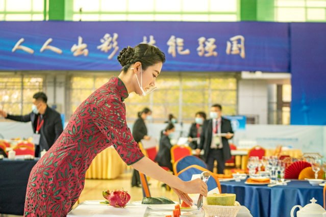 与往年相比,中餐“主题宴会设计”模块更具创意设计感,也更贴近时代主题;西餐“休闲餐厅服务”全程使用英文沟通服务,展现了选手更加全面的综合素质。此外,为了保证比赛的公平性和准确性,此次比赛采用了定制化的抽签及计分系统。同时,全力做好赛事疫情防控工作,实行赛前健康承诺、赛中测量体温、赛后疏导流动,从酒店到比赛地点实行闭环管理,并在校内及酒店设置了5个观摩区,参赛队可以在酒店通过直播观摩比赛。