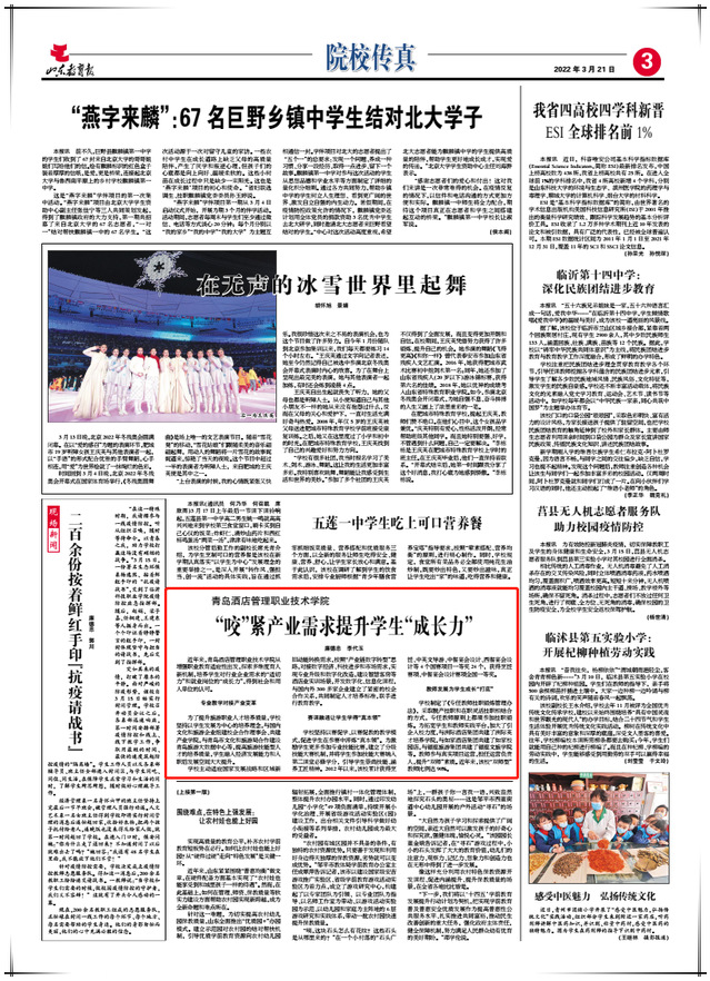 本网讯(党委宣传统战部)3月21日,《山东教育报》第三版以《红足一1世66814“咬”紧产业需求提升学生“成长力”》为题,报道学校增强职业教育适应性,探索多维度育人新机制,培养学生“适切力”和“成长力”的经验做法。全文如下: