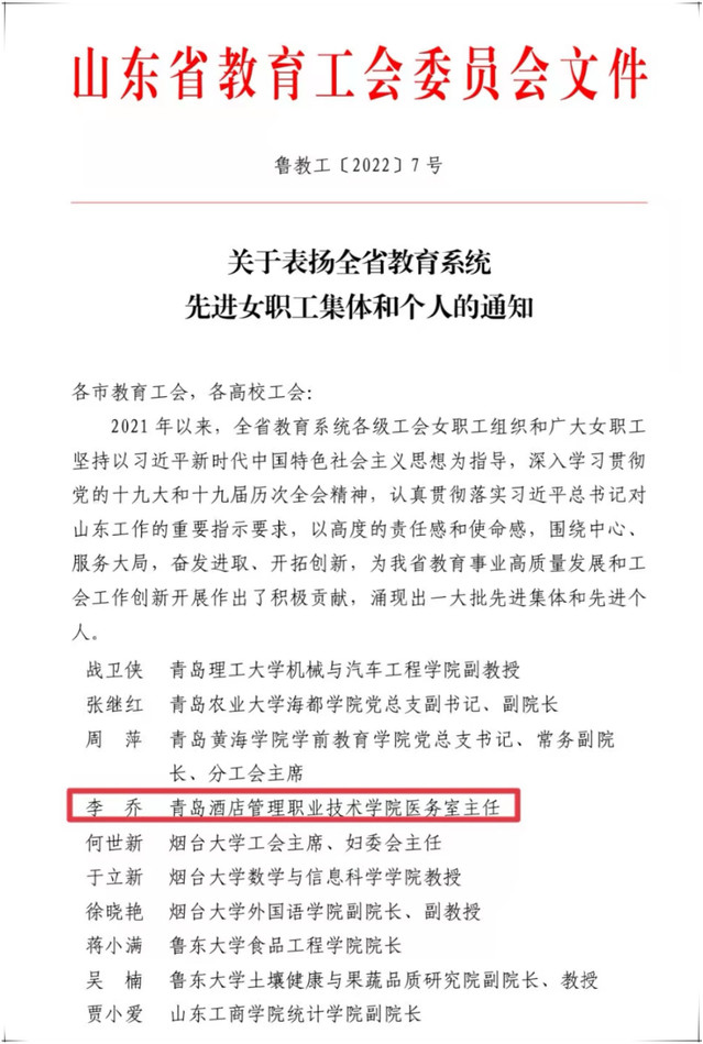 本网讯(工会 吴春雷)为表扬先进、树立典型,进一步激励全省教育系统广大女职工建功新时代、彰显新作为,近日,山东省教育工会委员会下发通知,评选表彰了一批全省教育系统女职工先进集体和个人,我校医务室李乔同志被授予“山东省教育系统女职工建功立业标兵”荣誉称号。