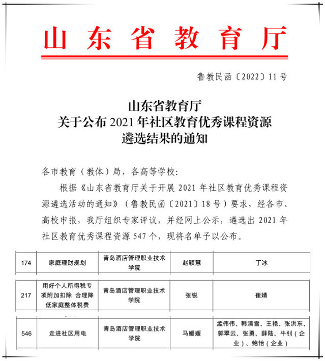 本网讯(继续教育学院)近日,山东省教育厅公布了2021年社区教育优秀课程资源遴选结果,我校赵颖慧老师的《家庭理财规划》、张锐老师的《用好个人所得税专项附加扣除合理降低家庭整体税费》和马媛媛老师的《走进社区用电》3门课程被评为优秀课程。