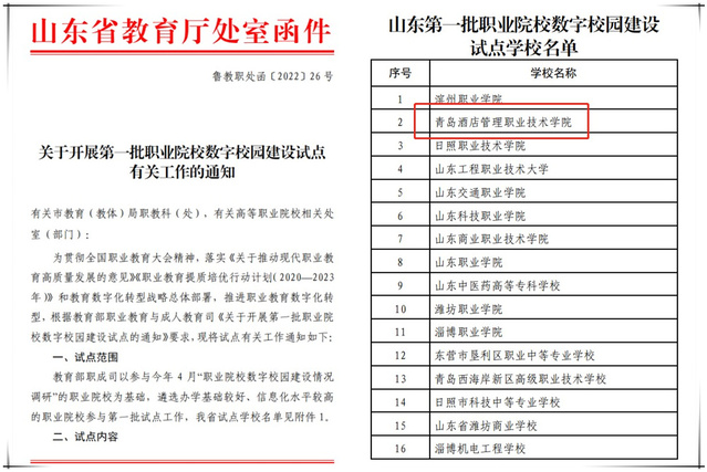 本网讯(教育信息中心 王风磊)近日,山东省教育厅发布了《关于开展第一批职业院校数字校园建设试点有关工作的通知》,全省共16所学校入选试点单位,我校名列其中。