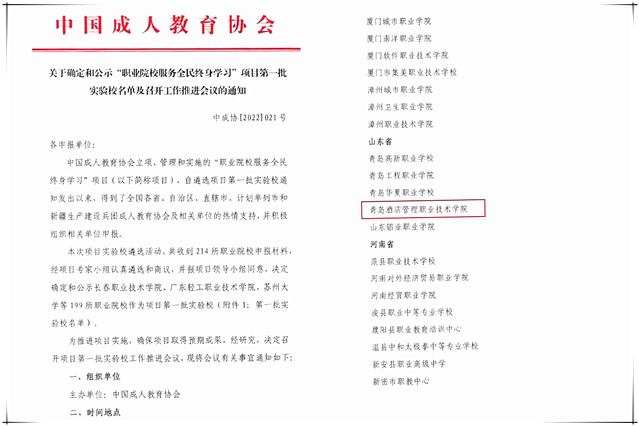 本网讯(继续教育学院 廖金城)近日,中国成人教育协会发布了“职业院校服务全民终身学习”项目实验校名单,我校入选全国第一批实验校。