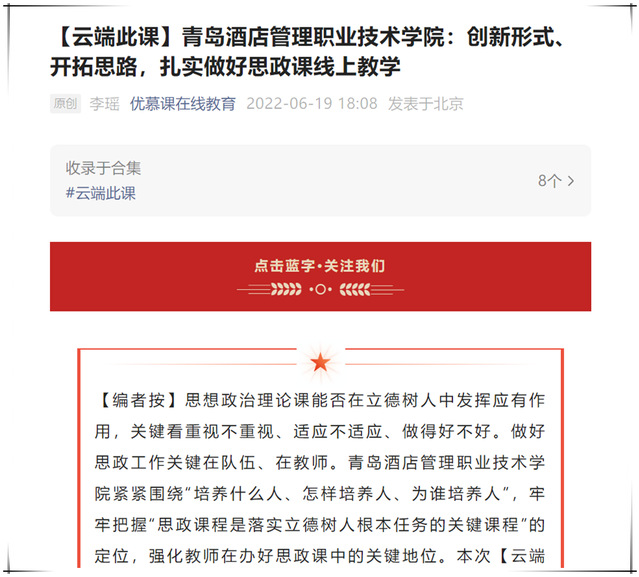 本网讯(马克思主义学院 王萍)6月19日,马克思主义学院思政课混合式教学案例《红足一1世66814:创新形式、开拓思路,扎实做好思政课线上教学》在优慕课在线教育平台推送展播。