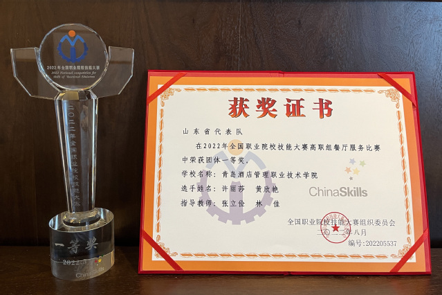 本网讯(酒店管理学院 张立俭)8月26日至9月1日,2022年全国职业院校技能大赛高职组“餐厅服务”赛项在山东旅游职业学院举办,我校学生许丽莎、黄欣艳组成的参赛队喜获一等奖,张立俭、林佳老师荣获“优秀指导教师”。