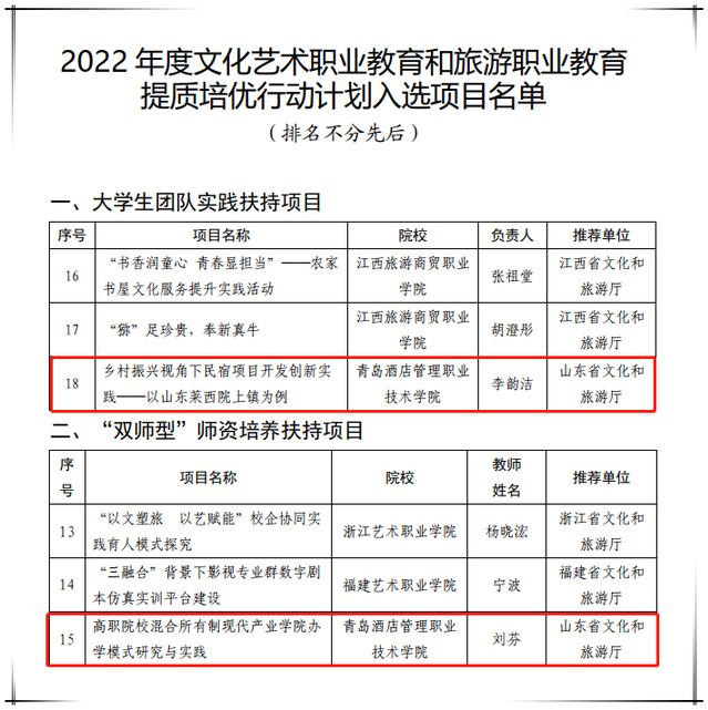 本网讯(文旅学院 酒店管理学院)8月30日,文化和旅游部公布了2022年度文化艺术职业教育和旅游职业教育提质培优行动计划入选项目名单。我校文旅学院刘芬副教授主持的《高职院校混合所有制现代产业学院办学模式研究与实践》项目入选“双师型”师资培养扶持项目,酒店管理学院李峰副教授、杨轶哲老师指导的《乡村振兴视角下民宿项目开发创新实践——以山东莱西院上镇为例》项目入选大学生团队实践扶持项目。