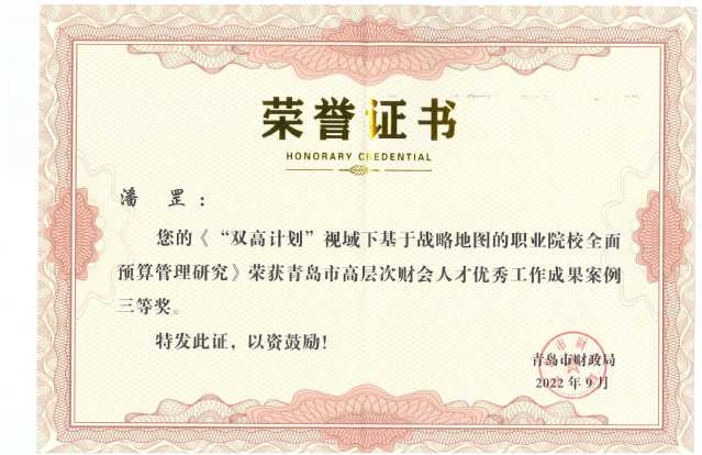 本网讯(科研发展处 财务处)近日,青岛市财政局公布了青岛市高层次财会人才工作成果案例评选获奖名单,我校财务处副处长潘罡申报案例《“双高计划”视域下基于战略地图的职业院校全面预算管理研究》获得三等奖,系青岛高校唯一获奖案例。