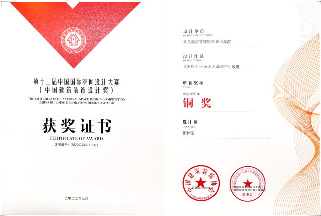 本网讯(艺术学院 于海龙)近日,由中国建筑装饰协会、深圳市福田区委、福田区人民政府主办的第十二届中国国际空间设计大赛(中国建筑装饰设计奖)落下帷幕,我校艺术学院张梦瑶同学的《安居——沂水大战地古村改造》设计作品获大赛铜奖,于海龙老师荣获优秀指导老师。