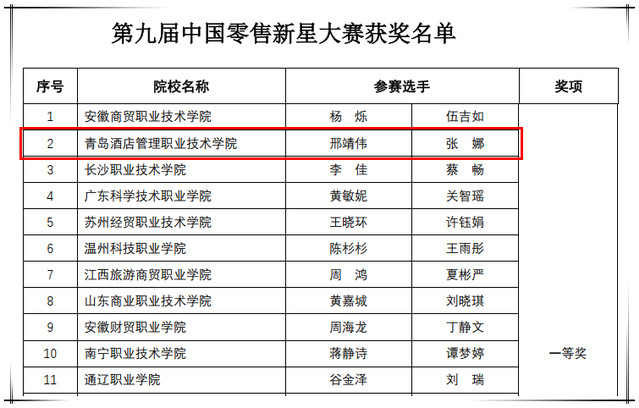 本网讯(工商管理学院 牛俊杰)近日,第九届中国零售新星大赛圆满落幕。我校工商管理学院2021级连锁经营与管理专业邢靖伟、张娜同学组成的代表队以总分第二名的成绩喜获一等奖,并获得恒欣奖学金;连锁经营与管理专业教师方玥、房瑞景获评“优秀指导教师”。