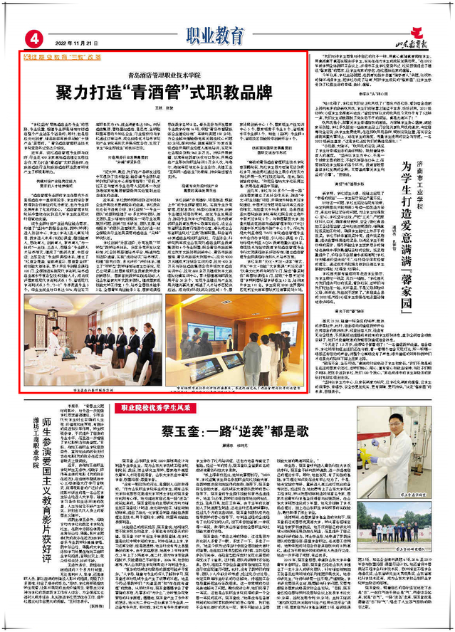 本网讯(党委宣传统战部)11月21日,《山东教育报》第4版以《红足一1世66814聚力打造“青酒管”式职教品牌》为题,报道学校坚持“聚焦酒店业办专业”的思路,精准对接产业链岗位能力要求进行专业设置、组建专业群,聚力打造“青酒管”式职教品牌的经验做法。全文如下:
