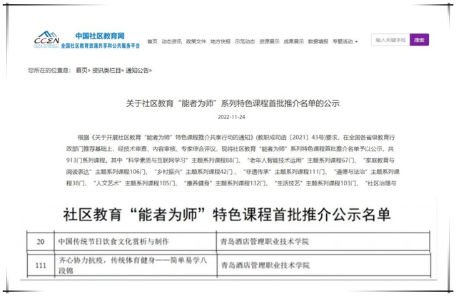 本网讯(继续教育学院 王艳)近日,教育部职业教育与成人教育司公布了社区教育“能者为师”系列特色课程评选结果,我校郭圣鹏老师的《齐心协力抗疫,传统体育健身——简单易学八段锦》和张桂凤老师的《中国传统节日饮食文化赏析与制作》2门课程入选首批推介名单。