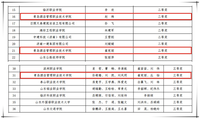 本网讯(酒店工程学院 赵炜)近日,2022年山东省“技能兴鲁”职业技能大赛——第二届山东省住建行业职业技能竞赛落下帷幕,来自全省住建领域121支队伍的421位参赛选手一同参加线上比赛。我校酒店工程学院教师赵炜、崔宪丽荣获职工组个人二等奖,建筑工程技术专业学生孙萌璐、刘凯、刘风玥获学生组团体三等奖。