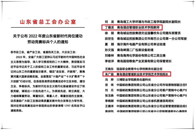 本网讯(工会 吴春雷)为深入学习贯彻党的二十大精神,进一步增强新时代劳动者的自豪感和使命感,近日,山东省总工会发布了《关于公布2022年度山东省新时代岗位建功劳动竞赛标兵个人的通知》,我校艺术学院朱广丽、烹饪学院丁德龙两位老师喜获“2022年度山东省新时代岗位建功劳动竞赛标兵个人”称号。