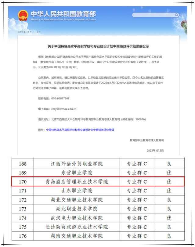 本网讯(“双高计划”建设办公室 吕春丽)近日,教育部发布《关于中国特色高水平高职学校和专业建设计划中期绩效评价结果的公示》,确定了全国197所“双高计划”建设单位的评价等级,我校获评“优秀”等级。