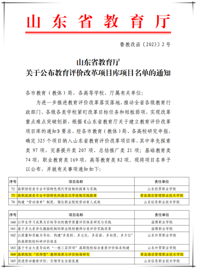 本网讯(组织人事处 张妍)近日,山东省教育厅公布教育评价改革项目库项目名单,我校教务处牵头的率先探索类《高职旅游类专业中国特色的高层次学徒制实践探索》和组织人事处牵头的完善提升类《高职院校“双师型”教师培养与评价标准研究》两个项目全部成功入库。