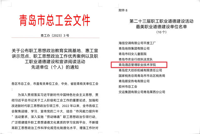 本网讯(工会 吴春雷)近日,青岛市总工会下发《关于公布职工思想政治教育实践基地、惠工宣讲示范点、职工思想政治工作优秀案例以及职工职业道德建设和宣讲阅读活动先进单位(个人)的通知》(青工办〔2023〕3号),我校荣获青岛市第二十三届职工职业道德建设活动“最美职业道德建设单位”称号。