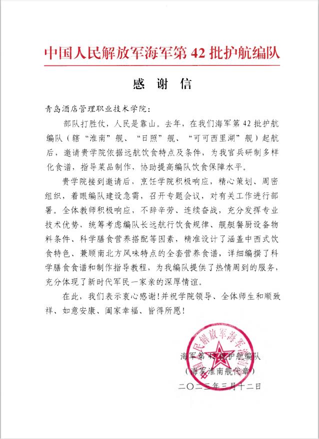 本网讯(烹饪学院 赵捷)近日,海军第42批护航编队向我校发来感谢信,对我校依据远航饮食特点及条件,研制多样化食谱,指导菜品制作,协助提高编队饮食保障水平表示感谢。