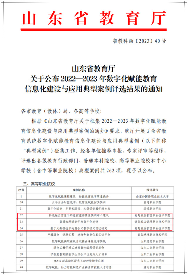 本网讯(教育信息中心 王风磊)近日,山东省教育厅公布了《2022-2023年数字化赋能教育信息化建设与应用典型案例评选结果》(鲁教科函﹝2023﹞40号),学校报送的3个案例全部入选。