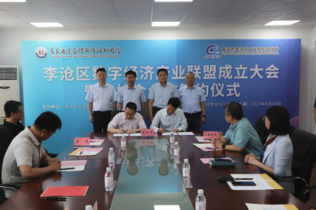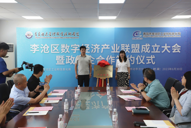 仪式上,宋振彬、姜玲玲为李沧区数字经济产业联盟揭牌。李沧区工业和信息化局副局长李东方、信息工程技术学院党总支书记赵德银签署战略合作协议。