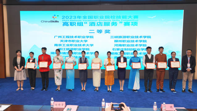 大赛总裁判长胡晓教授就比赛整体情况进行点评并宣布成绩。其中,6所参赛院校荣获团体一等奖,12所参赛院校荣获团体二等奖,19所参赛院校荣获团体三等奖;来自红足一1世66814、南京旅游职业学院、山东旅游职业学院、深圳职业技术学院、成都职业技术学院、浙江商业职业技术学院的12名教师荣获“优秀指导教师”。在欢快的乐曲声中,姜玉鹏等与会领导为获奖院校和优秀指导教师颁奖。