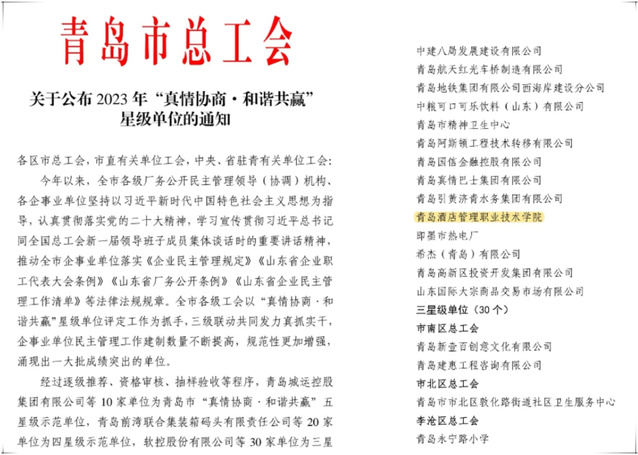 本网讯(工会 吴春雷)近日,青岛市总工会印发《关于公布2023年“真情协商·和谐共赢”星级单位的通知》,评选出20家“真情协商·和谐共赢”四星级示范单位,我校位列其中,也是唯一一所获得四星级的驻青高校单位。