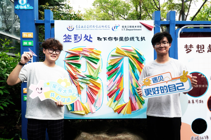 在各二级学院迎新点,缤纷横幅与特色展板辉映成趣,律动出明快、活力的迎新节拍。酒店管理学院为5位“开学日巧遇18岁”的“小寿星”们送上生日祝福,为新生定制“魅力酒管”限定版可乐,以新生证件照和名字打造专属打卡墙,增强新生归属感与学院向心力;文旅学院为每一位新生建立“幸福档案”,升级“幸福雅集”场景化专业体验区,设置特色导引旗,在互动中体现服务革新与文旅业态的有机统一;烹饪学院迎新别具匠心,新生推开80周年校庆大门开启十八岁的大学征程,第一课结合校史凝练出80种专业技能与素养,并献上80种祝福,彰显传承与成长的双向奔赴;酒店工程学院打造迎新情感地标“签到树”,设计“你好,新‘生’”易拉罐盆栽礼,师生共栽凝聚集体力量,让“会生长的礼物”伴随新生逐梦之旅。