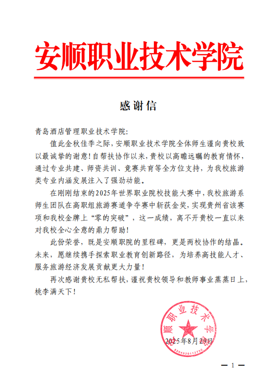 本网讯(文旅学院)近日,安顺职业技术学院向我校发来感谢信,对学校助力其在2025年世界职业院校技能大赛旅游赛道金奖实现“零的突破”表示感谢,对我校帮扶协作工作的成效予以高度评价。
